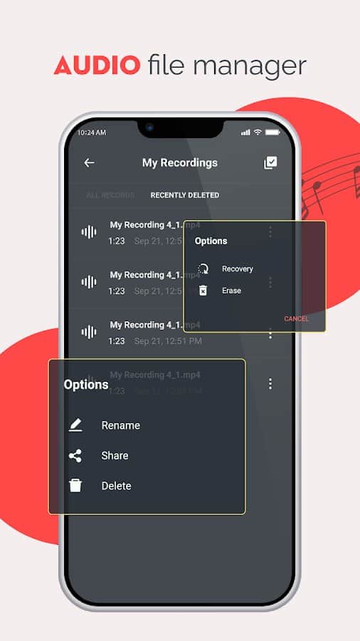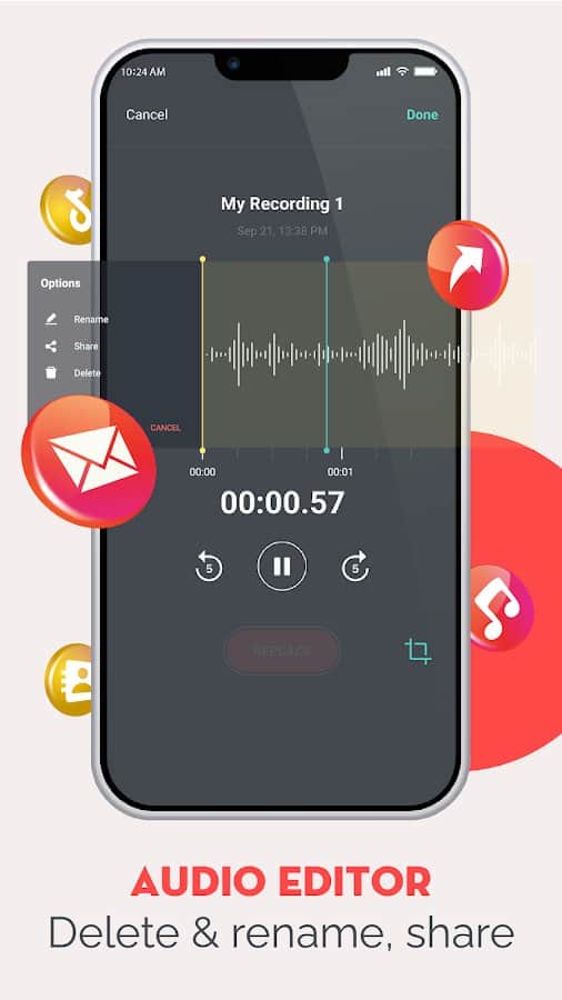 Grabadora de Voz, Grabadora de Audio - Graba todas las conversaciones necesarias que necesitarás escuchar nuevamente en el futuro. La aplicación admite completamente un micrófono de alta calidad, por lo que cualquier grabación se reproducirá de la mejor manera. Con una interfaz simple, puedes ordenar fácilmente todas las grabaciones de audio, eliminar algunas de ellas o editar aquellas que no te gustan. Graba entrevistas, conferencias, reuniones, llamadas telefónicas, tu propia voz o canto, memorizando así información importante, manteniéndola en repetición.
