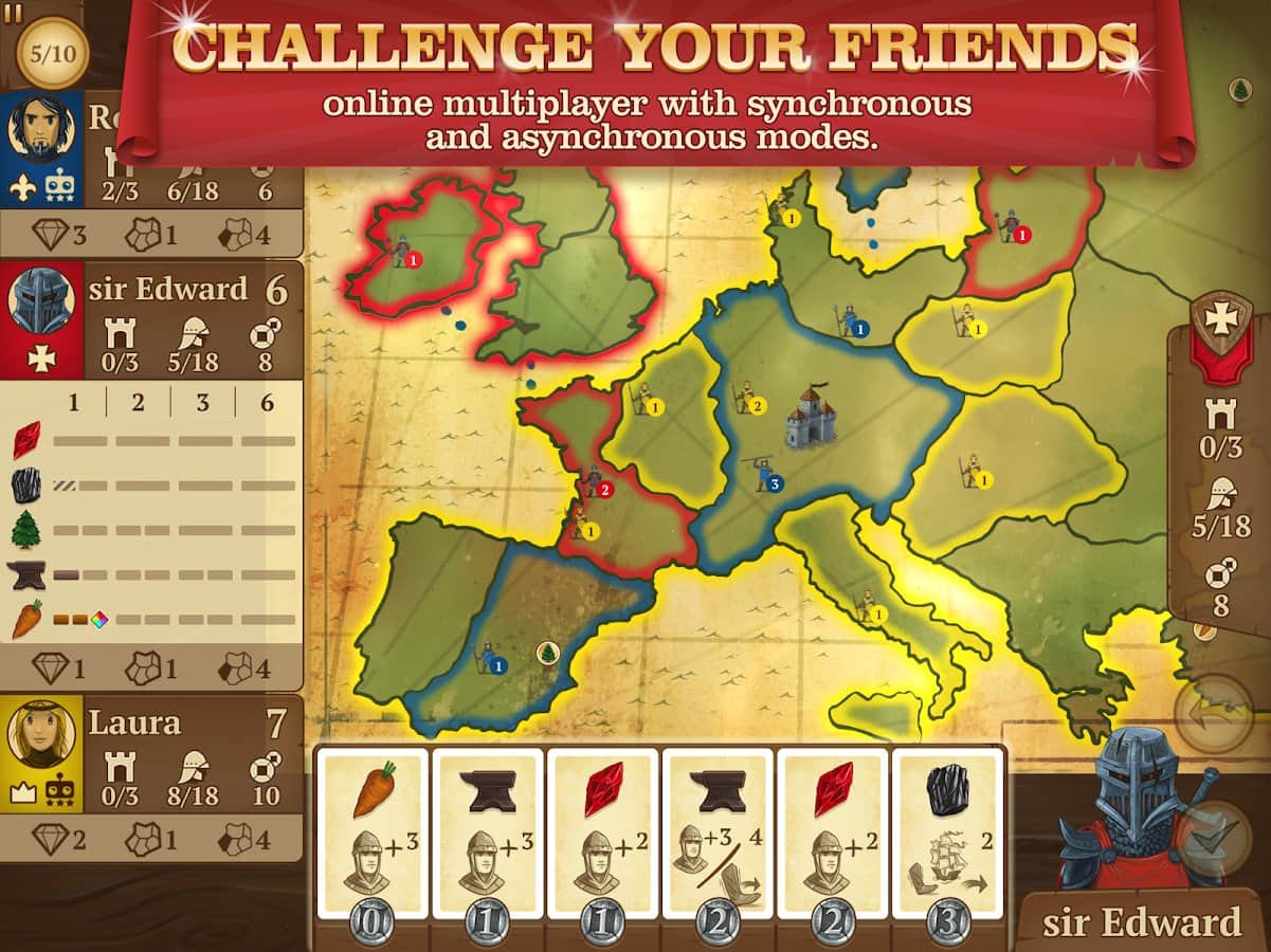 Empire de Ocho Minutos (Eight-Minute Empire) – un juego de mesa para Android donde construirás tu imperio en ocho minutos. En este juego tu tarea será reunir tu ejército invencible, comandar las tropas y luchar contra otros jugadores destruyendo sus castillos. Todo lo que harás será debilitar a tus oponentes y cómo puedes fortalecer mejor tu imperio. En este juego puedes jugar simultáneamente de 2 a 5 jugadores que elegirán cartas para realizar diversas acciones. Explora un enorme mapa del juego y toma mayor control, ganando puntos.