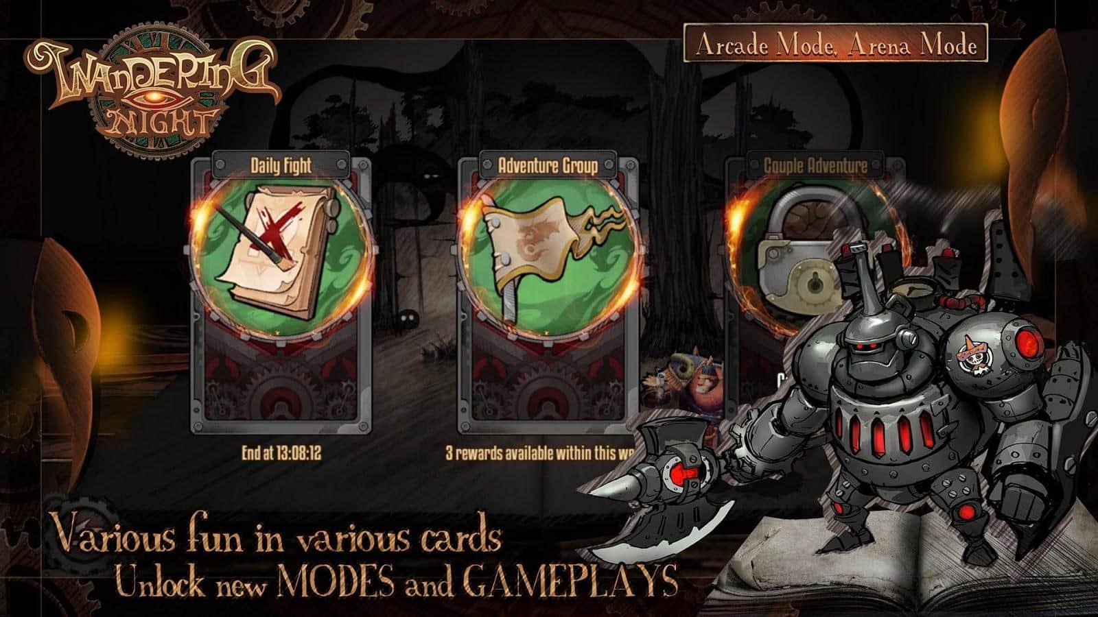 Noche Errante – juego de cartas para Android que te sumergirá en un mundo mágico donde redescubrirás el cuento familiar. En este juego te esperan emocionantes viajes y batallas con oponentes. Explora tu mundo y encuentra en tu camino a numerosos personajes familiares de cuentos de hadas que se convertirán en tus amigos y te ayudarán a derrotar a los oponentes. Colecciona cartas y úsalas en la batalla. Cada mapa en este juego tiene sus propias características y habilidades. Comprueba en acción todos los modos de juego y obtén numerosos bonos y logros.