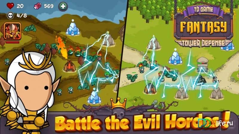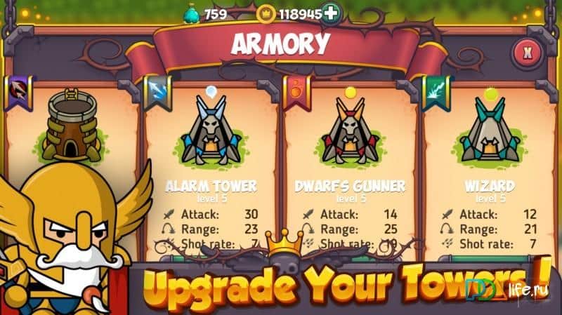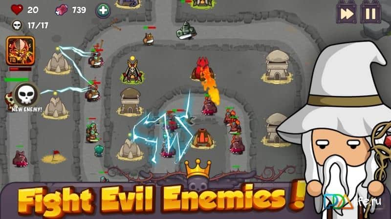 Warlords Clash - Kingdom TD – estrategia para Android, donde defenderás tu reino de los enemigos. En este juego, tu tarea principal es construir torres defensivas y fortificaciones para evitar que el hechicero no muerto y los monstruos avancen. Emprende un fascinante viaje a través de bosques, cuevas y llanuras y lucha contra las fuerzas oscuras sin darles la oportunidad de llegar al castillo. Coloca tus torres en puntos estratégicos y destruye una ola de enemigos tras otra. Controla tu ejército compuesto por arqueros, guerreros y caballeros. Usa magia y hechizos devastadores y derrota a los enemigos.