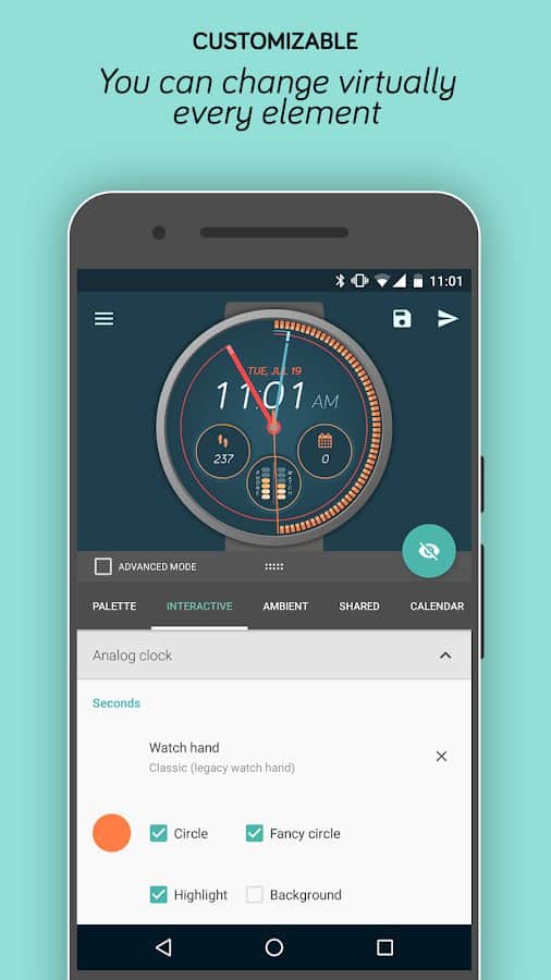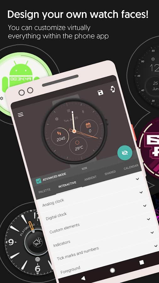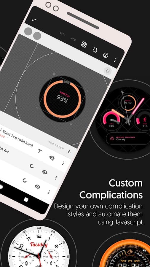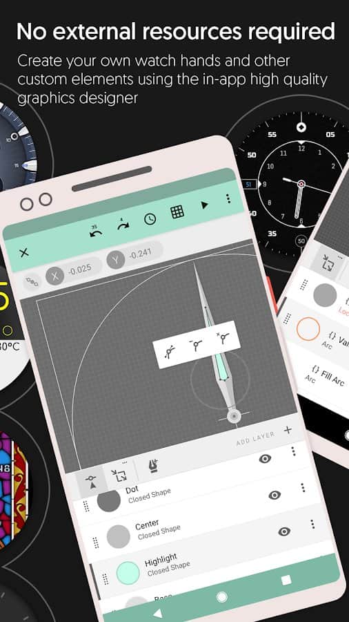 Usando la aplicación Watch Face Designer, puedes crear tus propias esferas de reloj para relojes inteligentes con Wear OS utilizando el diseñador integrado y un programa de inicio rápido. Agrega cualquier imagen, texto, cambia el diseño de las agujas y más. El panel personalizable te permite cambiar parámetros importantes del reloj con unos pocos toques y usarlos para fitness, calendario, visualización del clima, etc. Los detalles sofisticados del reloj te permitirán crear tu propio estilo con soporte para gráficos vectoriales. La biblioteca en la nube de esferas te permitirá seleccionar el diseño deseado y experimentar con él hasta que crees la imagen perfecta.