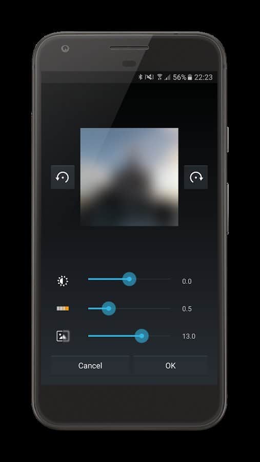 - Edición de fondo propio (desenfoque, brillo, saturación, rotación)