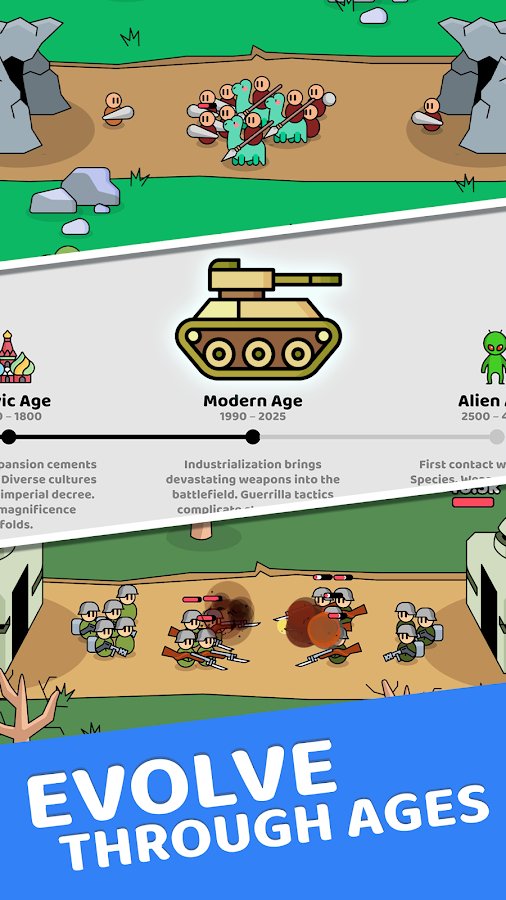 ¡Usa la comida para reunir tropas y ganar batallas contra el enemigo! ¡Envía dinosaurios a la batalla en la Edad de Piedra, guerreros espartanos en la Edad de Hierro y tanques en la era moderna! ¡Gana guerras y conviértete en el mejor comandante que el mundo haya visto!