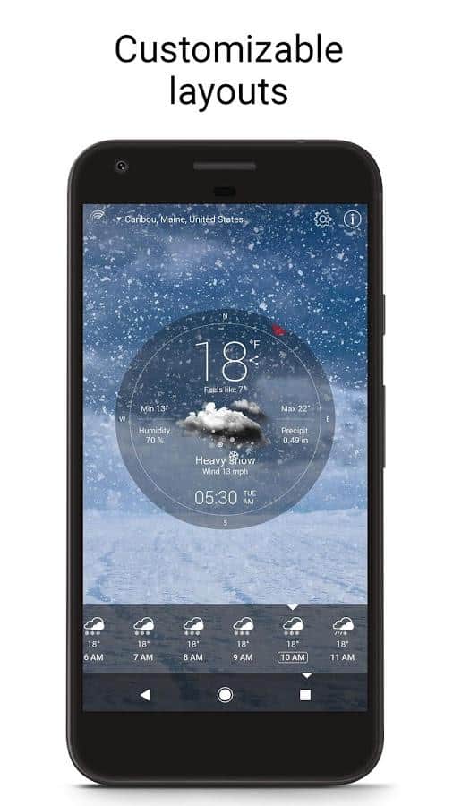 - Interfaz de aplicación personalizable: Toda la información sobre el clima, un pronóstico del clima corto, el pronóstico del clima para la semana, Información sobre el clima actual, Solo texto