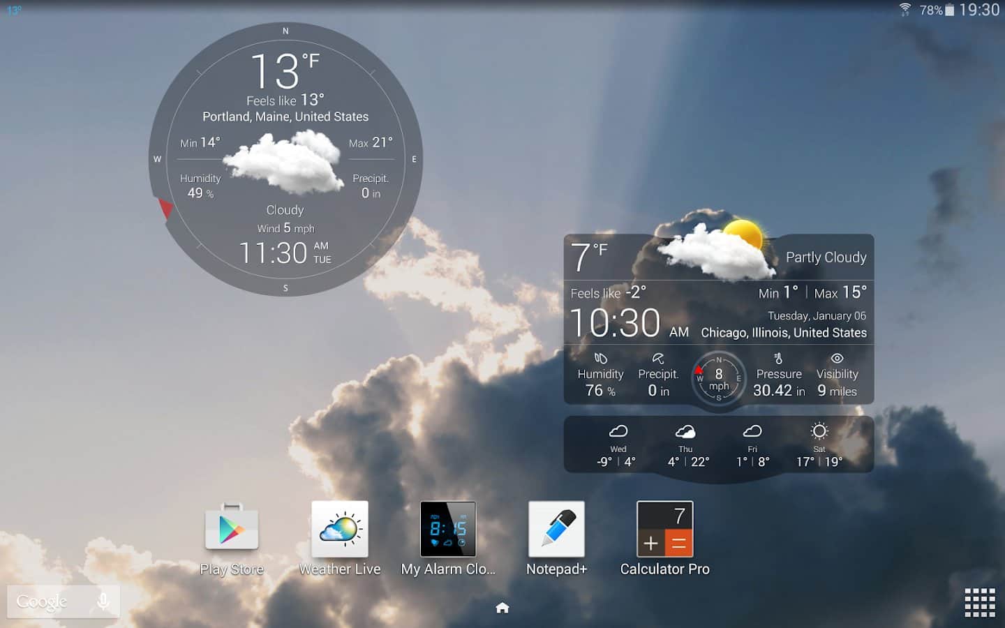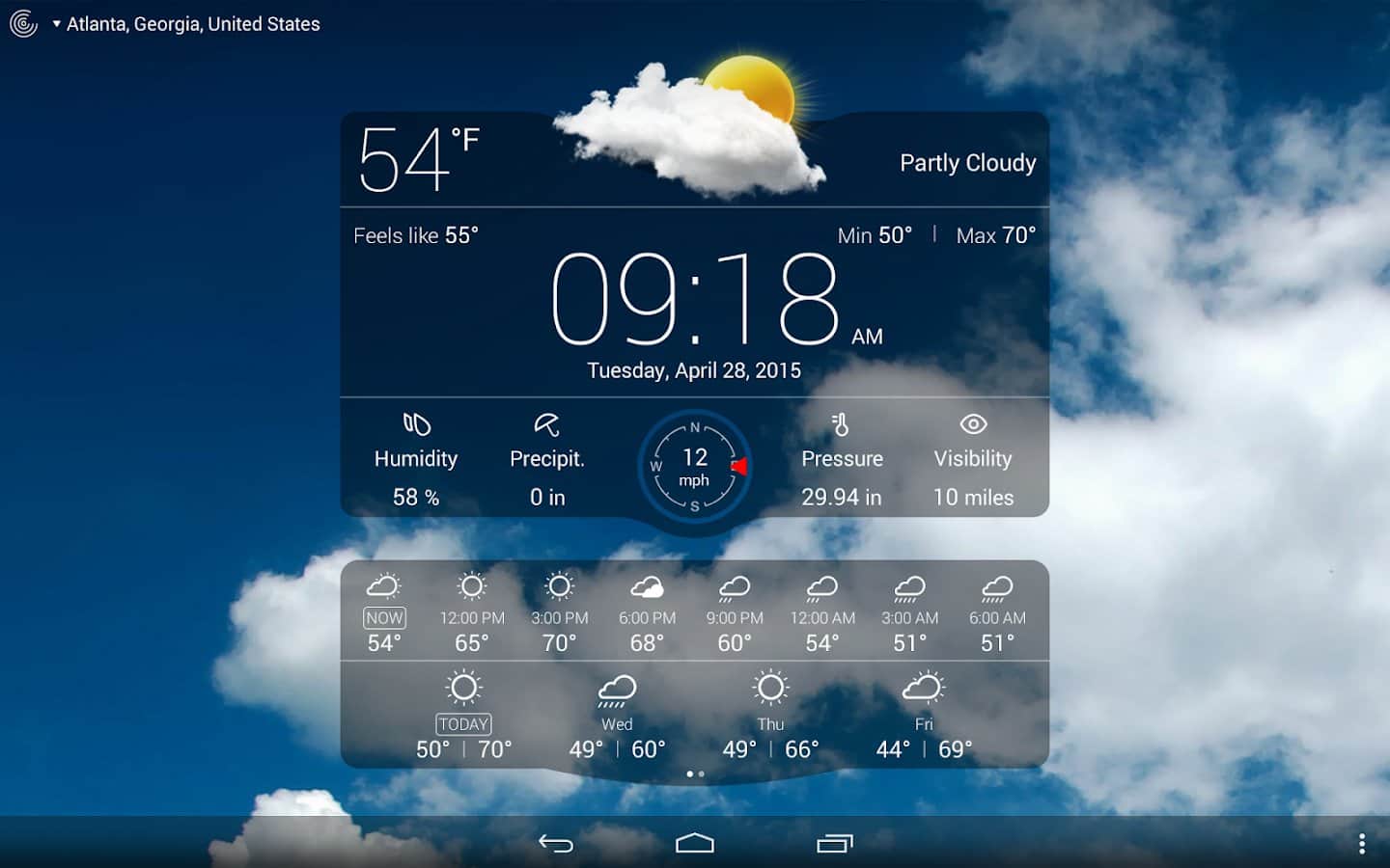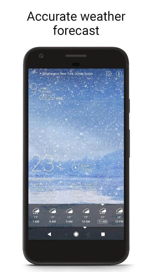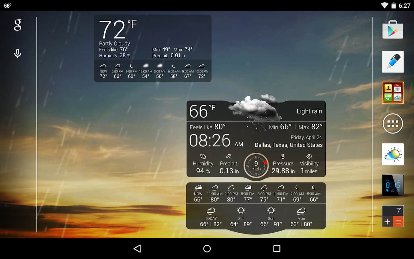 Weather Live – un hermoso widget del clima para tu smartphone o tableta Android del desarrollador Apalon. Una excelente animación mostrará en tu dispositivo el clima fuera de la ventana, y a tu solicitud, el clima en cualquier parte del mundo. La aplicación te dará información sobre el clima para los próximos 7 días, mostrará la temperatura "se siente", la dirección y velocidad del viento, la visibilidad en la carretera y más. Mantente informado sobre el clima detrás de tu ventana por la mañana, aún acostado en la cama.