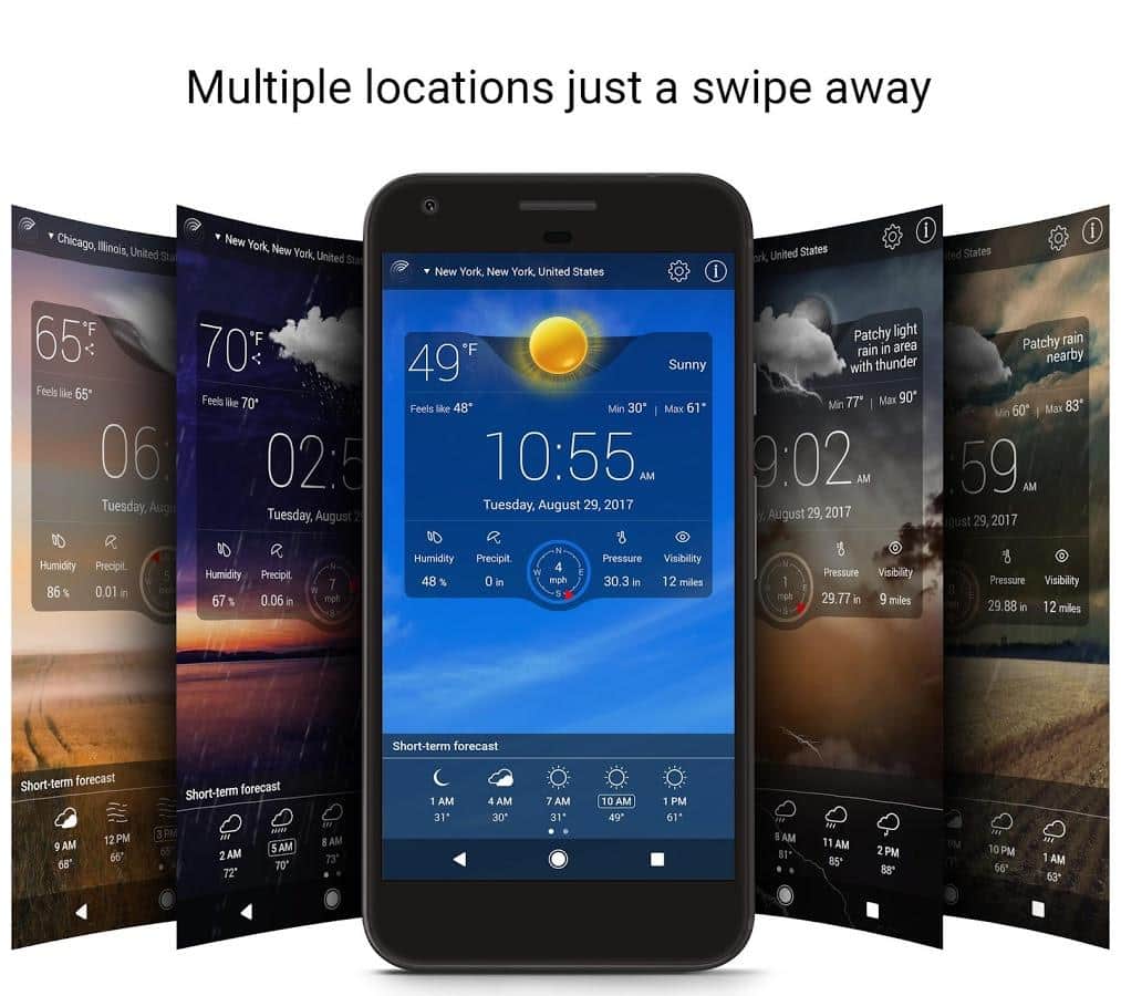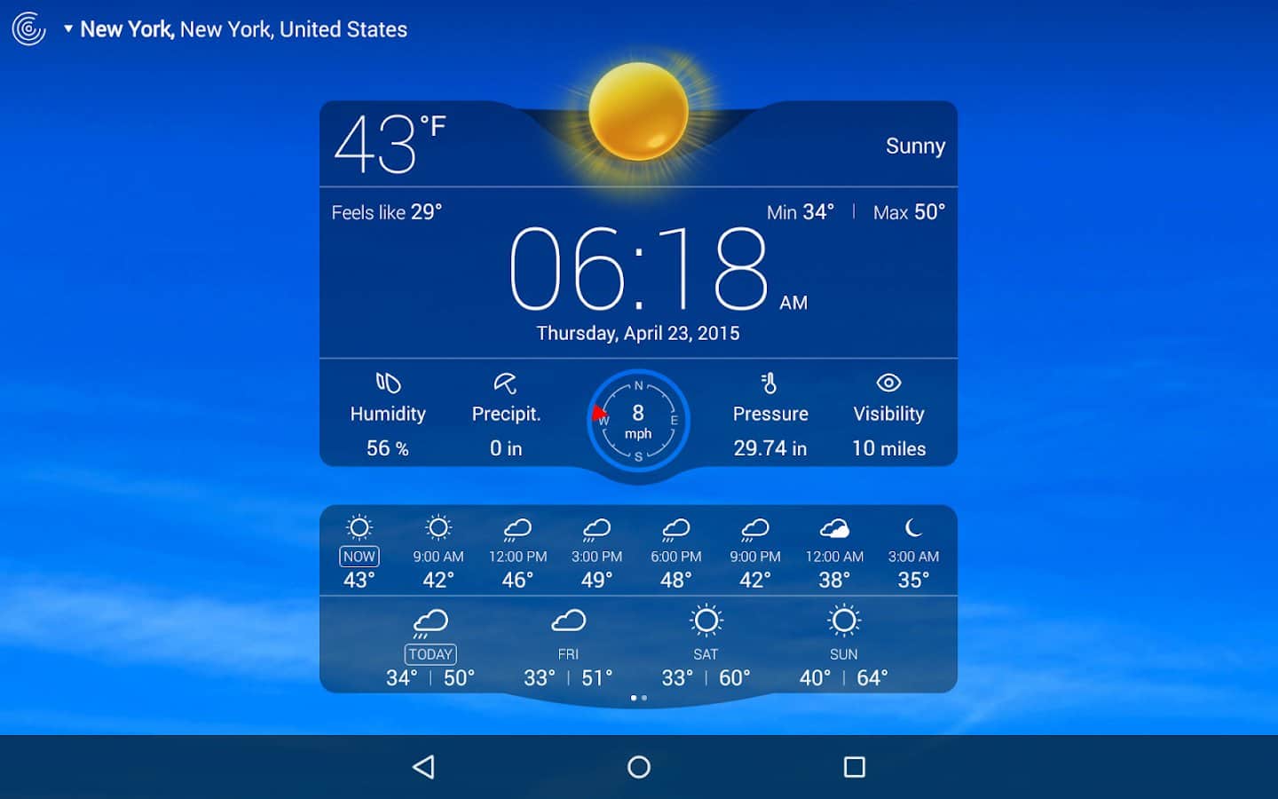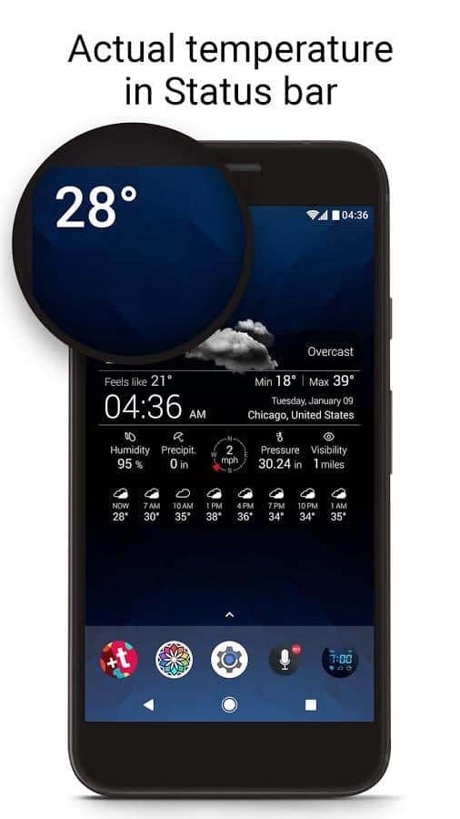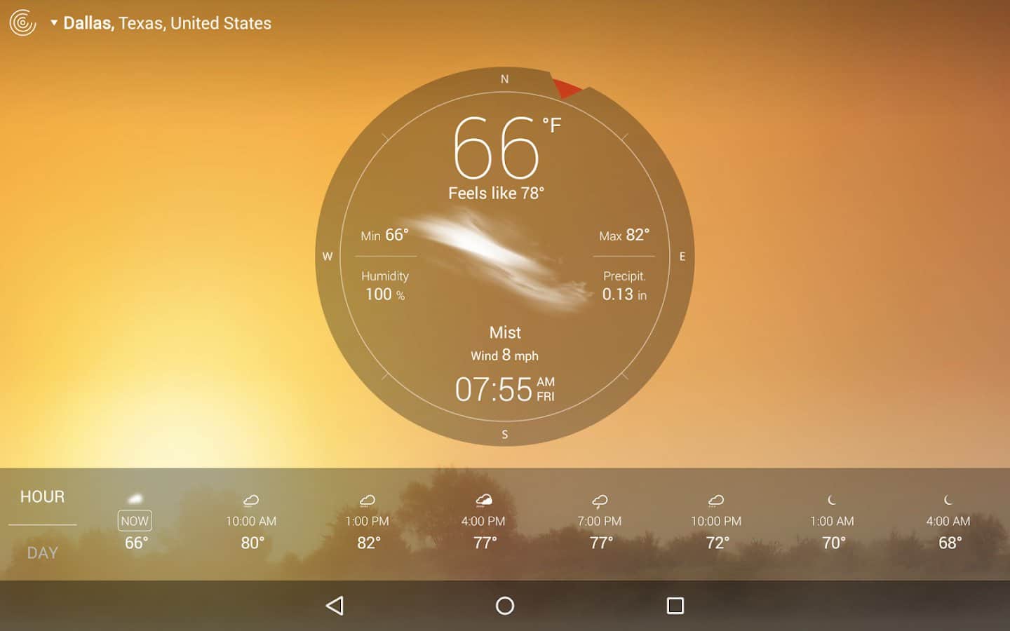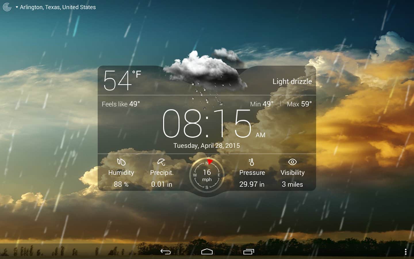 Weather Live – un hermoso widget del clima para tu smartphone o tableta Android del desarrollador Apalon. Una excelente animación mostrará en tu dispositivo el clima fuera de la ventana, y a tu solicitud, el clima en cualquier parte del mundo. La aplicación te dará información sobre el clima para los próximos 7 días, mostrará la temperatura "se siente", la dirección y velocidad del viento, la visibilidad en la carretera y más. Mantente informado sobre el clima detrás de tu ventana por la mañana, aún acostado en la cama.