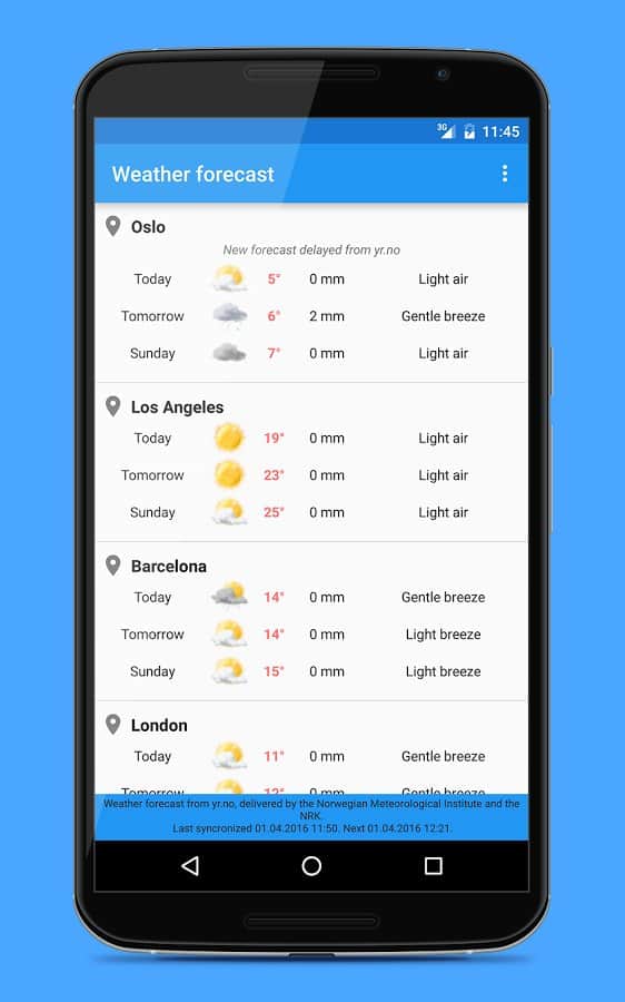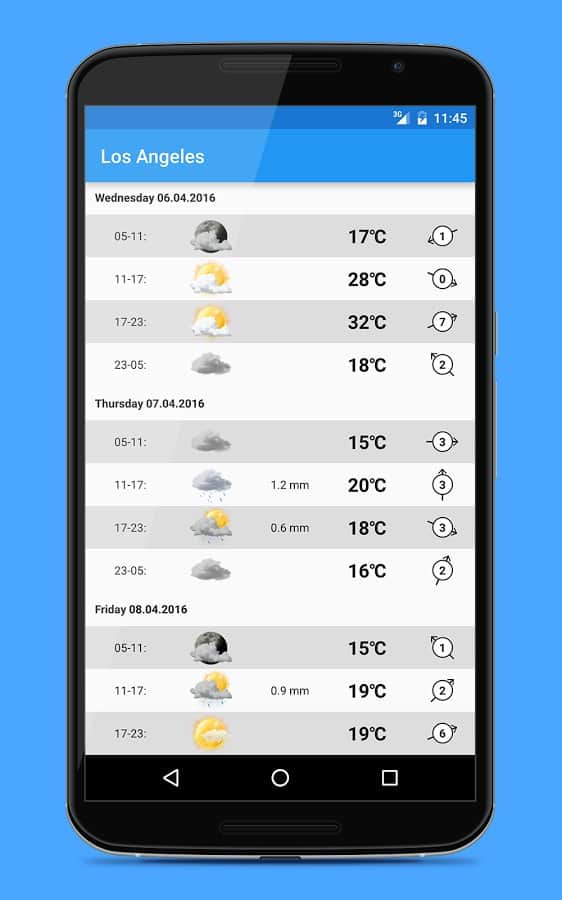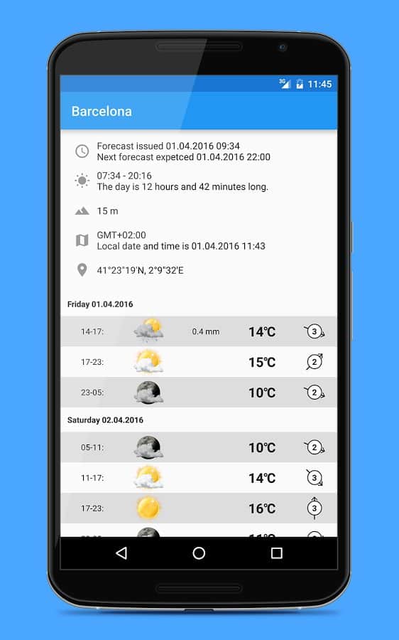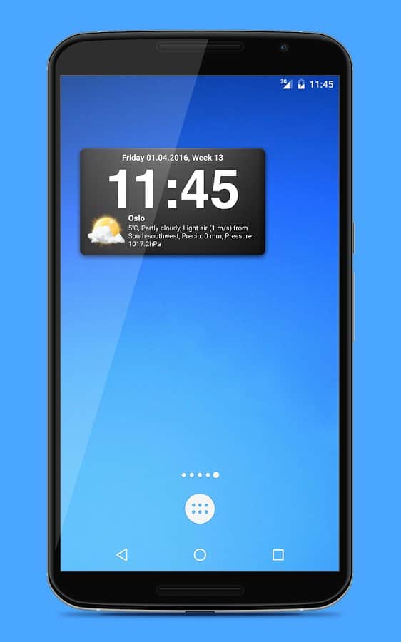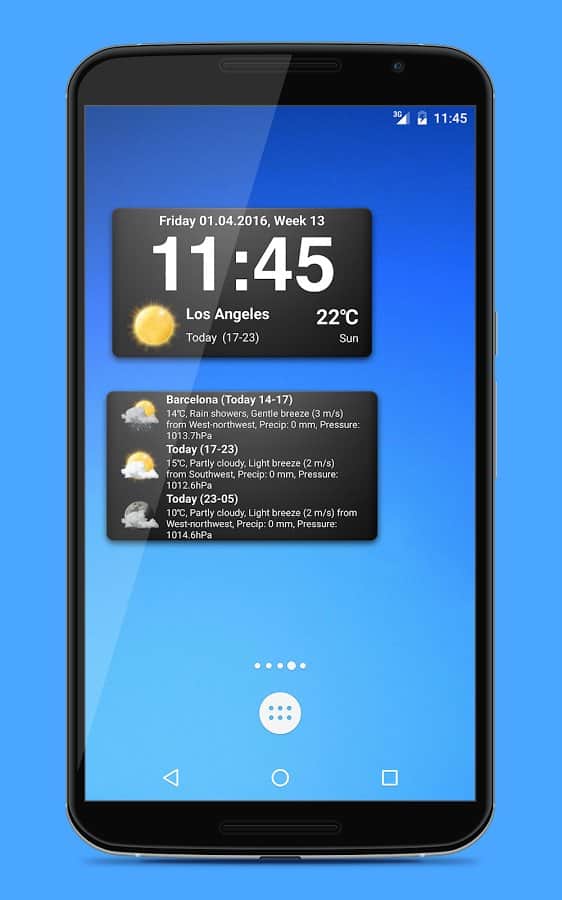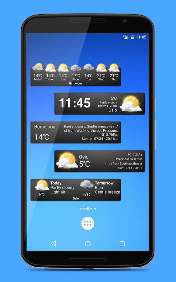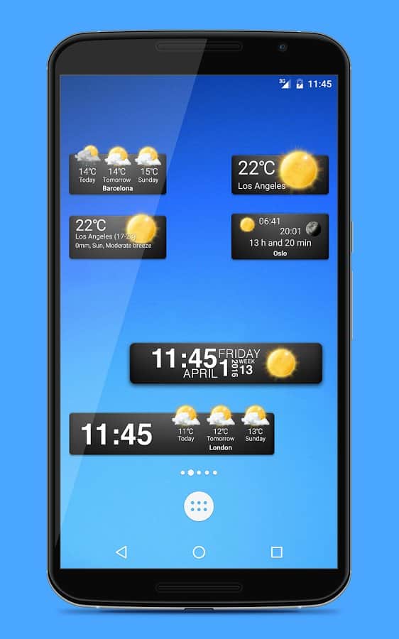 Widgets del clima: 18 widgets en 3 tamaños diferentes. El pronóstico del tiempo contiene información sobre 9 días por adelantado y se divide en 4 periodos por día, para obtener datos más precisos. La aplicación puede encontrar automáticamente tu ubicación y mostrar el clima en una ciudad aburrida.