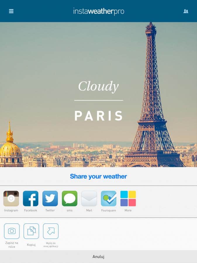 Weathershot de Instaweather - Sigue el clima alrededor del mundo de una manera muy inusual y curiosa, ¡es decir, con fotos! Sí, has oído bien, esta aplicación combina el instagram analógico y el clima. Al abrir el mapa verás imágenes de personas que están asignadas a los territorios definidos y de esta manera puedes ver el clima en cualquier parte del mundo. Sin embargo, recientemente las personas se han dividido no solo por el clima sino también por otras imágenes, y la aplicación que fue creada originalmente para mostrar el clima, cada vez más comienza a parecerse a una red social.