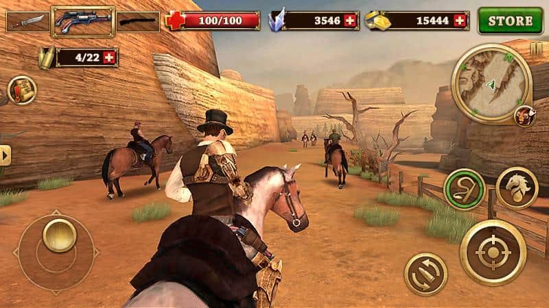 West Gunfighter – un fascinante tirador para Android, donde te transportan al mundo del Viejo Oeste. En este juego jugarás como un vaquero, solitario, intrépido y peligroso. Toma un arma y explora una variedad de ubicaciones, buscando algo divertido que hacer. En el juego podrás realizar varias tareas y misiones, incluso podrás elegir tu rol en el juego convirtiéndote en un criminal, saqueando y matando a todos a tu alrededor, o en un noble caballero salvando a personas inocentes y matando criminales. Compra una variedad de trajes de vaquero para el héroe, juega al blackjack o participa en duelos.