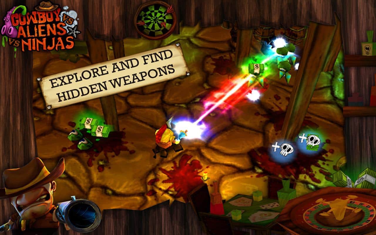 Western Mini Shooter - un juego en Android en el que te encontrarás en el Viejo Oeste y lucharás contra ninjas y alienígenas. Ayuda al valiente vaquero Chuck en su misión y previene la invasión de enemigos, para esto tienes en tu arsenal una gran variedad de armas y municiones.