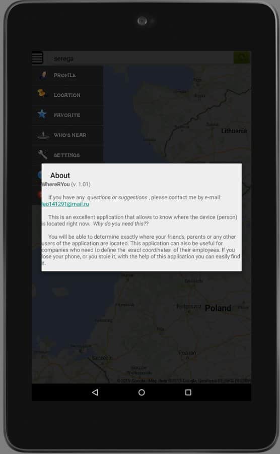WhereRYou – con esta sencilla aplicación siempre podrás entender dónde se encuentra en este momento el dispositivo en el que está instalada esta aplicación. Ahora siempre podrás determinar con precisión dónde se encuentra el dispositivo y, en consecuencia, su propietario. Hay muchas formas de usar una aplicación así. Por ejemplo, se puede instalar el programa a todos los empleados de una empresa de mensajería y coordinar su movimiento. Se puede utilizar como medio de vigilancia personal y así sucesivamente. Si te han robado el teléfono, con la ayuda de la aplicación siempre podrás determinar su ubicación.
