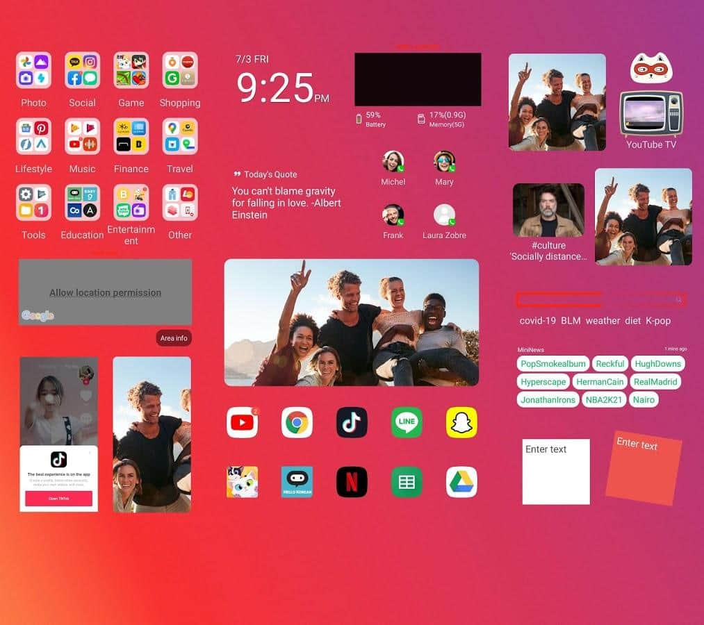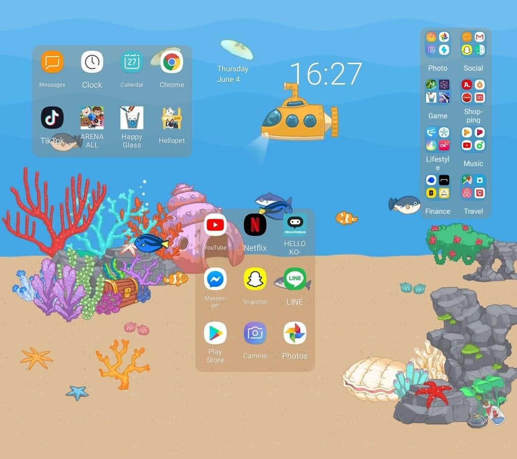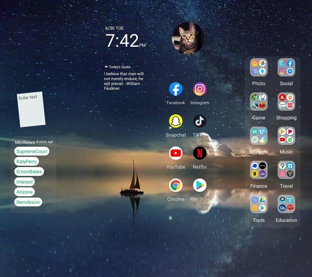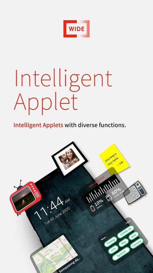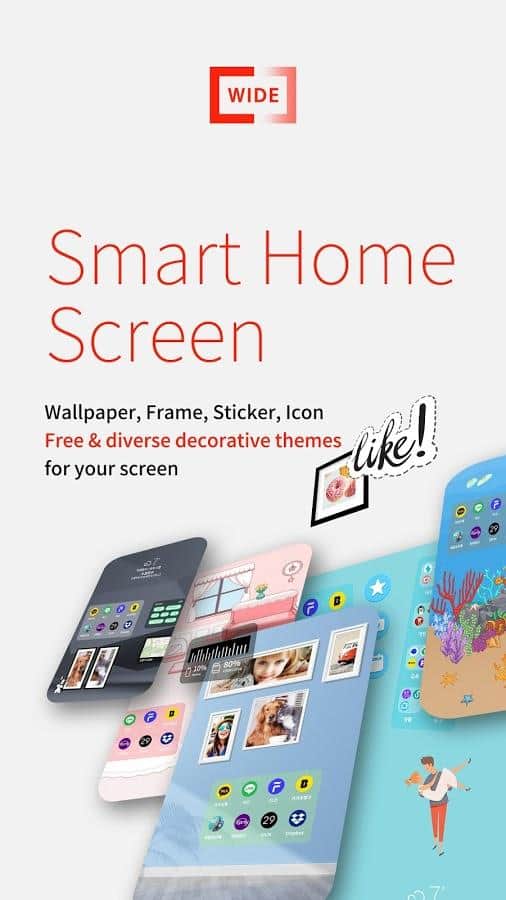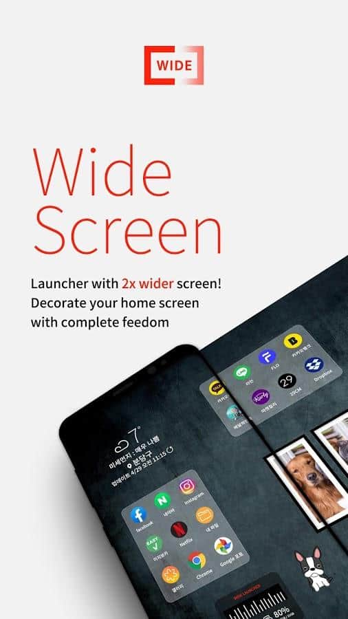 Con la ayuda del conveniente lanzador Wide Launcher - 2x más ancho, decoración sin baldosas con el tamaño de pantalla aumentado, verás nuevas funciones y características para acomodar tus aplicaciones y elementos principales (widgets, íconos).