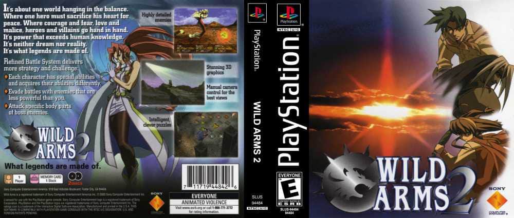 Wild Arms 2 - Explora territorios completamente nuevos, pero prepárate para el hecho de que difíciles desafíos y intensas batallas con los monstruos que allí habitan aparecerán en tu camino. Tres personajes principales se reunieron para atravesar duras batallas: Ashley (soldado), Brad (criminal, ex héroe) y Lilka (hechicera). Adéntrate en oscuros calabozos y utiliza la magia, el combate y otras habilidades que solo tú posees. La misión más importante de esta aventura es deshacerse del demonio atrapado dentro del protagonista.