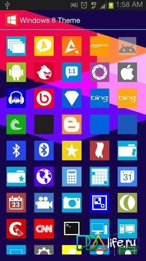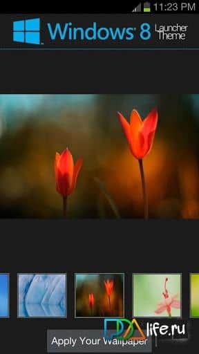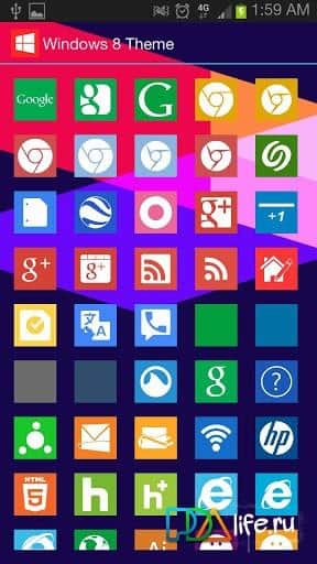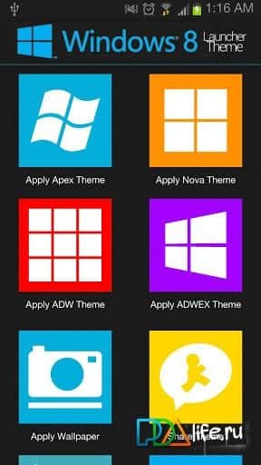 El tema de Windows 8 - para dispositivos Android es un tema interesante para iniciar shells de Apex Launcher, Nova y ADW. Instala la aplicación en tu teléfono inteligente o tableta y tendrás a tu disposición fondos de pantalla de calidad HD, que en total son al menos 18 piezas y 400 iconos diferentes al estilo de Windows 8.