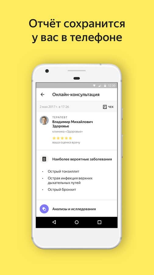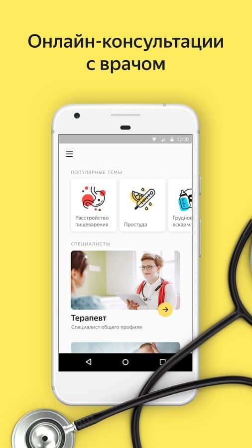 Yandex Health es una aplicación única que te permite desde casa obtener asesoría del doctor que te interesa. En Yandex, la Salud realmente hay muchos y definitivamente encontrarás el que necesitas. No es necesario ir a ningún lado y hacer filas. Recibirás resultados completos de tu "visita" al doctor, incluyendo ayuda, tarjeta de mantenimiento, obtención de un diagnóstico y métodos de tratamiento. Por supuesto, el servicio es de pago, pero la primera consulta Yandex te la da de regalo. Para hacerlo, ingresa el código promocional de sus otras aplicaciones, por ejemplo, el código TRANSPORT .