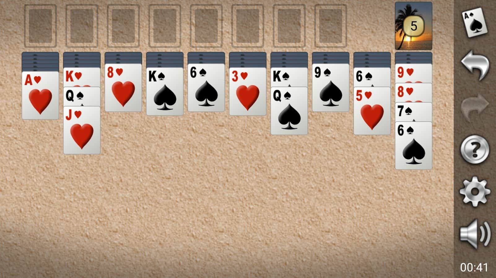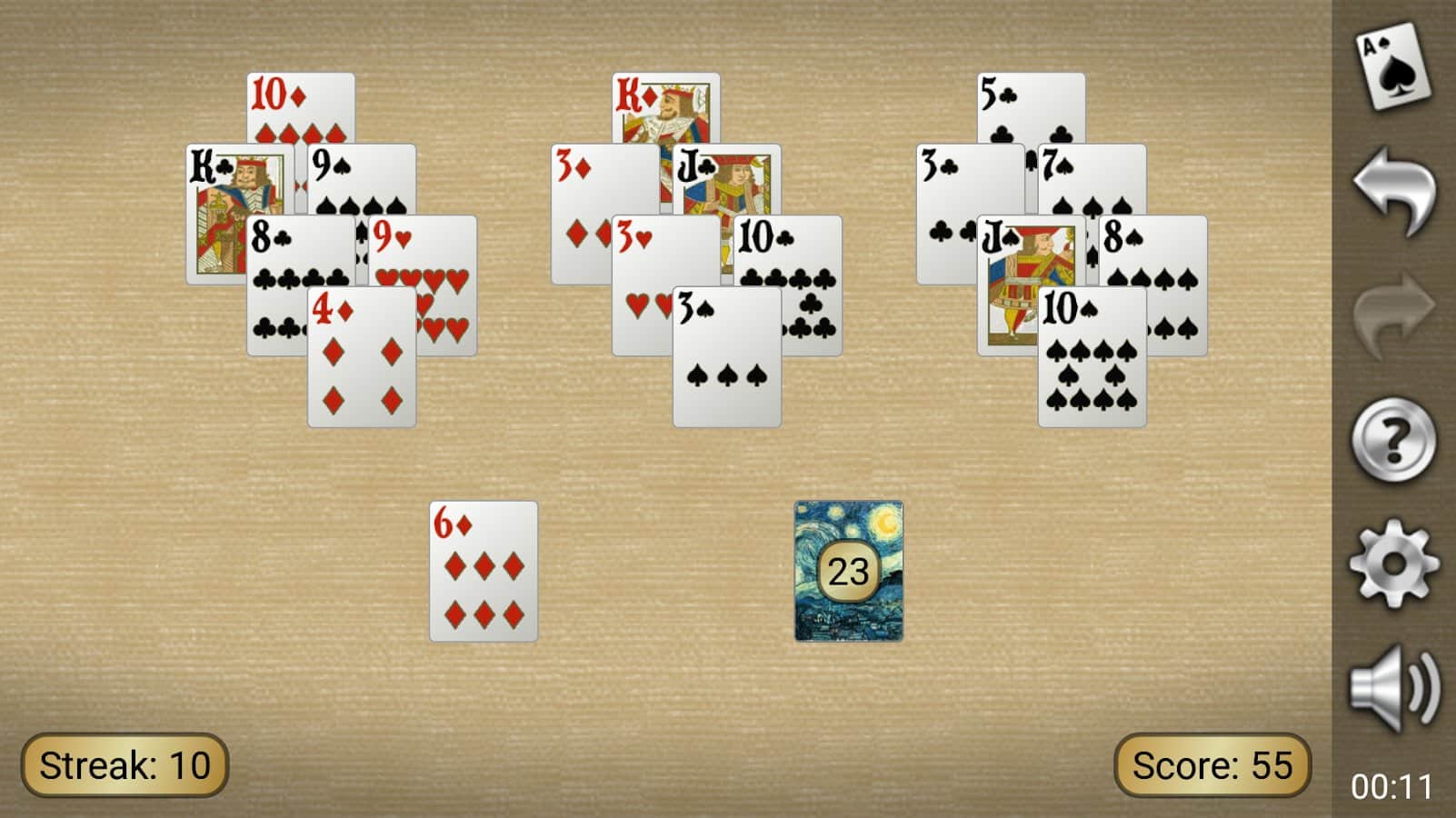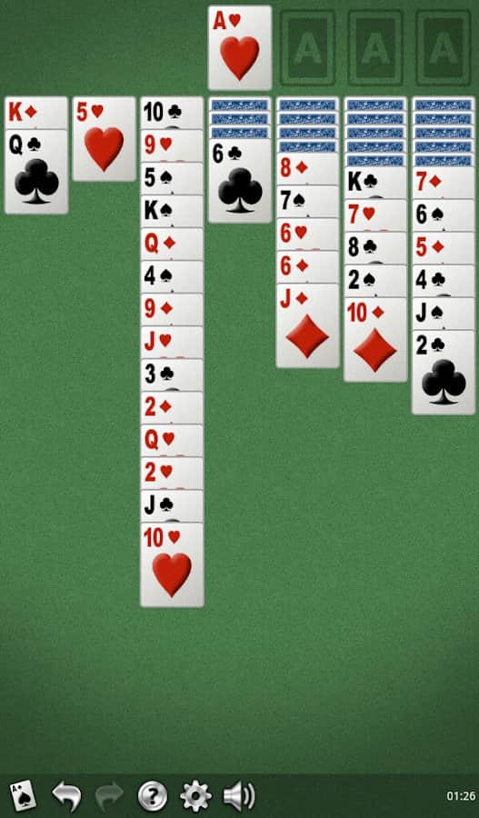 Yukon Gold Solitaire es un juego de cartas de solitario en Android donde podrás jugar tus juegos favoritos en tu teléfono o tableta. Juega al solitario en cualquier momento libre y disfruta de excelentes gráficos y numerosas opciones en el campo de juego. El objetivo de este juego es que debes colocar todas las cartas en orden, comenzando con un valor alto y terminando con el más bajo. El juego tiene una función para cancelar el movimiento, si dudas de la corrección de tu decisión, haz una carga.