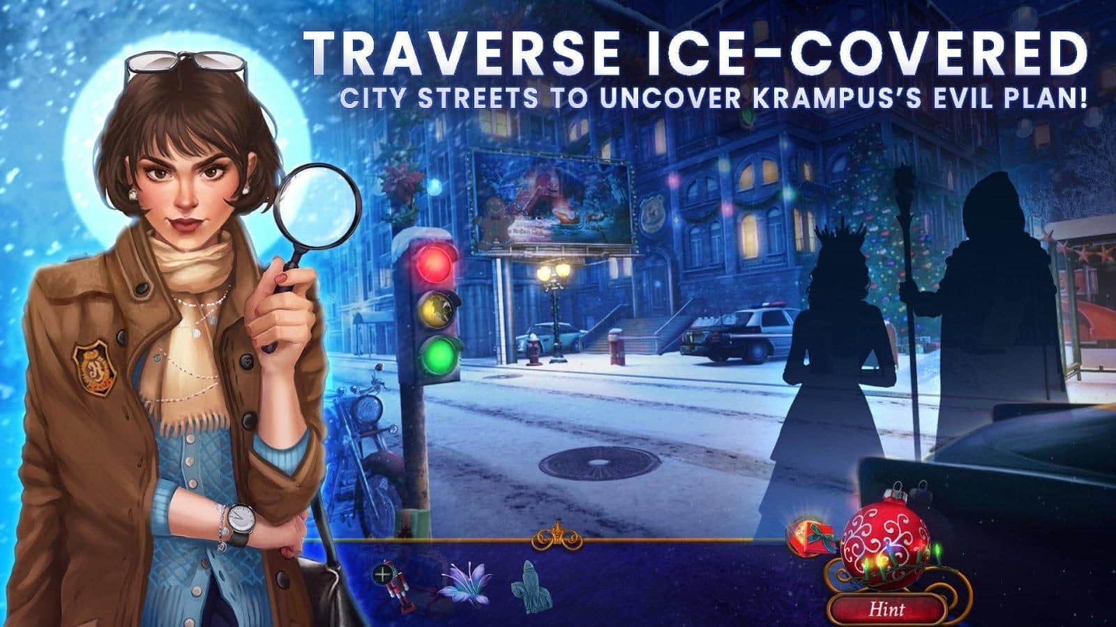 una historia de Navidad: Santa está en peligro – ve a una reunión de aventuras invernales y descubre todos los secretos y misterios del juego. En este juego actuarás como la detective navideña Bridget Wolfe, quien se preparaba para celebrar las fiestas navideñas envuelta en una manta y sorbiendo cacao caliente. De manera inesperada, alguien tocó a su puerta: la Sra. Santa, lo que cambió todos los planes de nuestra detective. Su esposo es acusado de un robo despreciable que Santa no cometió, sino que un verdadero ladrón robó la voz reconocible de Santa Claus. Ante tal vileza e injusticia, nuestra heroína se dispone a investigar el asunto y hará cualquier cosa para recuperar el espíritu de la Navidad. Explora más de 35 ubicaciones invernales en busca de pistas y resuelve desafiantes rompecabezas.