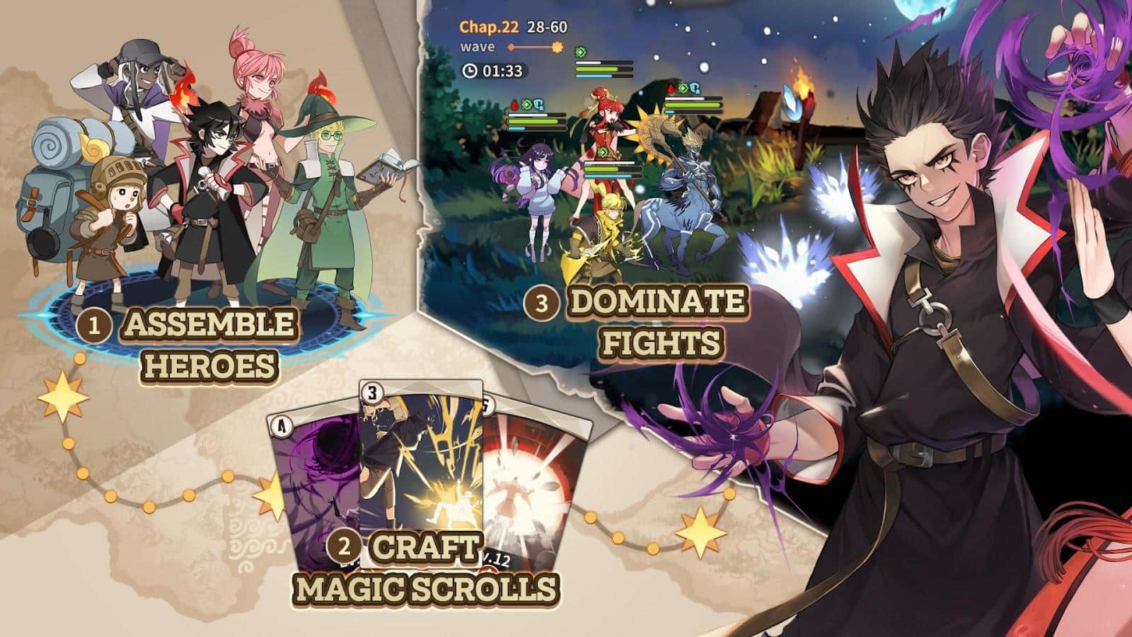 ZIO y los Pergaminos Mágicos - En el proceso de cómo el poderoso mago Zio y sus aliados lucharon contra el siniestro mago, y finalmente lo blanquearon, el personaje principal se quedó sin magia. Lo único que Zio podía hacer era crear pergaminos mágicos, con la ayuda de los cuales cada persona puede tener un poder especial. Entra en la batalla más fuerte de la historia y observa cómo las personas comunes usan la magia que reciben. Realiza una investigación detallada, completa tu propia colección con personajes asombrosos, obtén oportunidades adicionales.