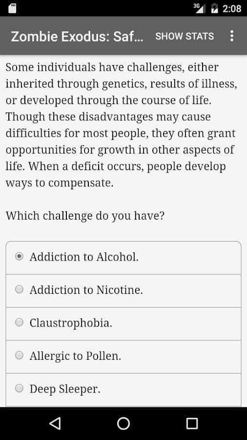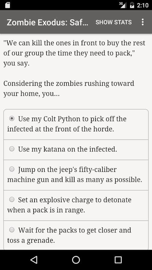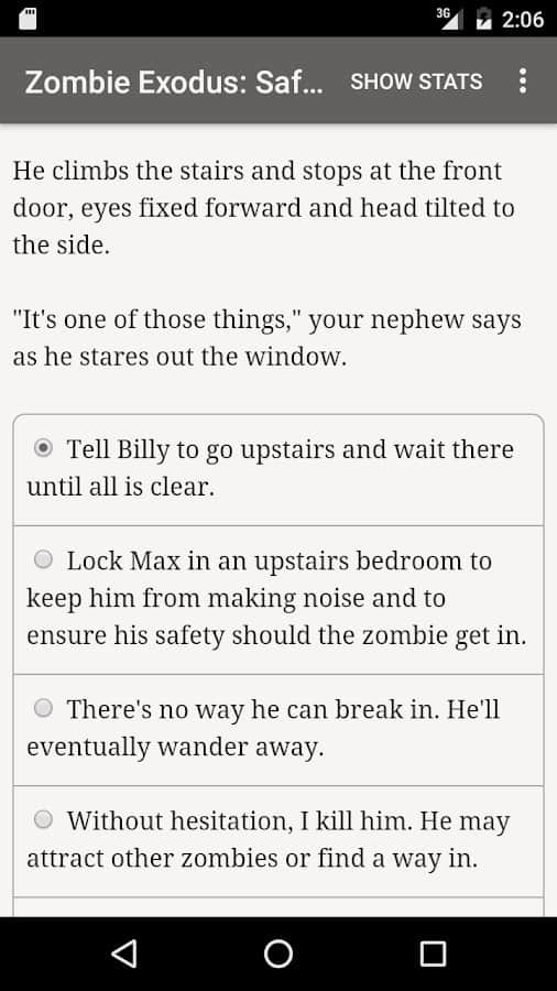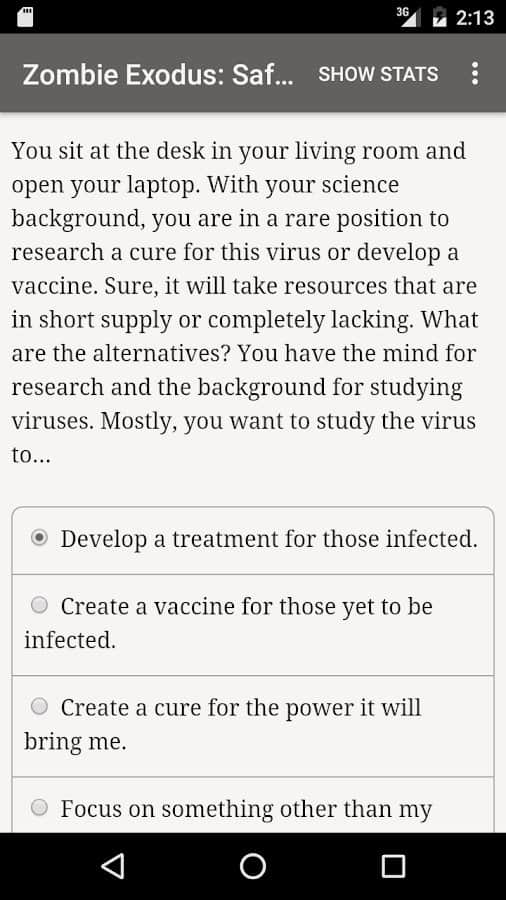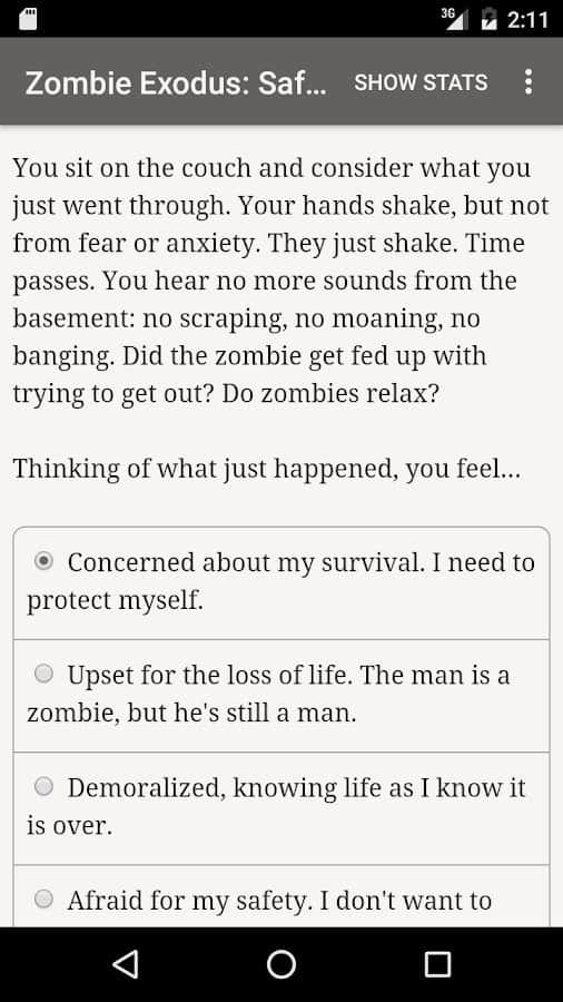Zombie Exodus: Safe Haven es una novela interactiva en Android donde jugarás el papel de supervivientes después de un Apocalipsis zombi. En este juego podrás elegir tu personaje, puede ser un matón despiadado, un ladrón, un hacker paranoico, un estafador psicopático, un idealista pragmático, un científico o un adolescente. La trama del juego comenzará desde los primeros días del Apocalipsis donde tienes que sobrevivir en condiciones extremas y hacer todo lo posible para mantenerte vivo. El juego se basa completamente en la letra, en él encontrarás animaciones y efectos de sonido, y será impulsado por tu imaginación.