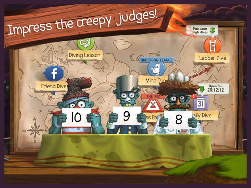 Zombie High Dive - este emocionante juego de arcade sobre saltar desde un acantilado al agua. Existe incluso un deporte llamado cliff diving. Como los atletas son zombies, no tienen miedo de saltar, porque ya están muertos desde hace mucho tiempo. ¿Qué hay que temer? Así que, conviértete en un virtuoso del salto y trata de mantener todas tus partes del cuerpo. Y cuanto más peligroso y peor sea el salto, más puntos obtendrás. ¡Elige tu modo de dificultad y no temas enfrentarte al Jefe!