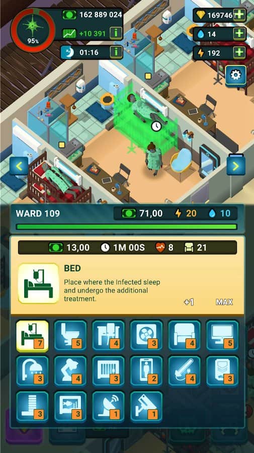 Hospital Zombie - Idle Tycoon - El mundo que una vez fue hermoso ahora se está convirtiendo en ruinas, zombis rabiosos deambulan por las calles vacías. En solo unos días, un peligroso virus pandémico ha barrido todo el planeta, ¡y enfrentas el desafío de resistir sus devastadoras consecuencias! Las personas que quedaron vivas después del apocalipsis se unieron para crear refugios en los que crearon una medicina, gracias a la cual los zombis podrán encontrar una nueva vida. ¿Estás listo para tomar el control de uno de los hospitales de zombis? Comienza con un pequeño hospital y haz todo lo posible para convertirlo en un moderno centro para el tratamiento de los pacientes más peligrosos del planeta.
