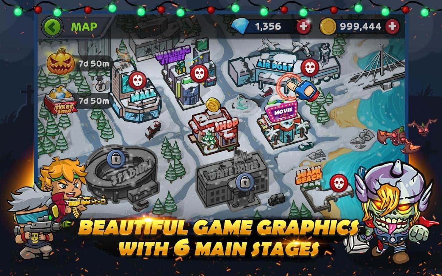 Los muertos vivientes: Juego de los Muertos – una fascinante galería de disparos para Android, donde destruirás multitudes de zombis. En este juego, serás transportado a un futuro lejano en el año 2030, donde en Nueva York han aterrizado hordas de zombis y atacan a todas las personas, convirtiéndolas en los muertos vivientes. Después de ese terrible día, solo sobrevivió un hombre llamado D-Man. Comienza a planear tu guerra contra los zombis, eligiendo armas y ocupando una buena posición, disparando a los muchos enemigos que te rodean por todos lados. Mueve a través de tres ubicaciones diferentes como: el centro comercial, la calle y el aeropuerto. Con cada nuevo nivel, la dificultad del juego aumentará y tendrás que esforzarte mucho para acabar con todos. Gana oro y gemas y por las misiones completadas, mejora tus armas.