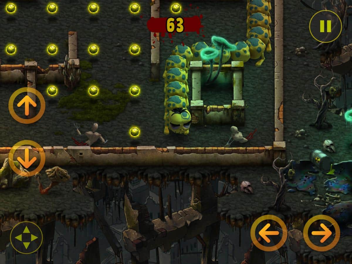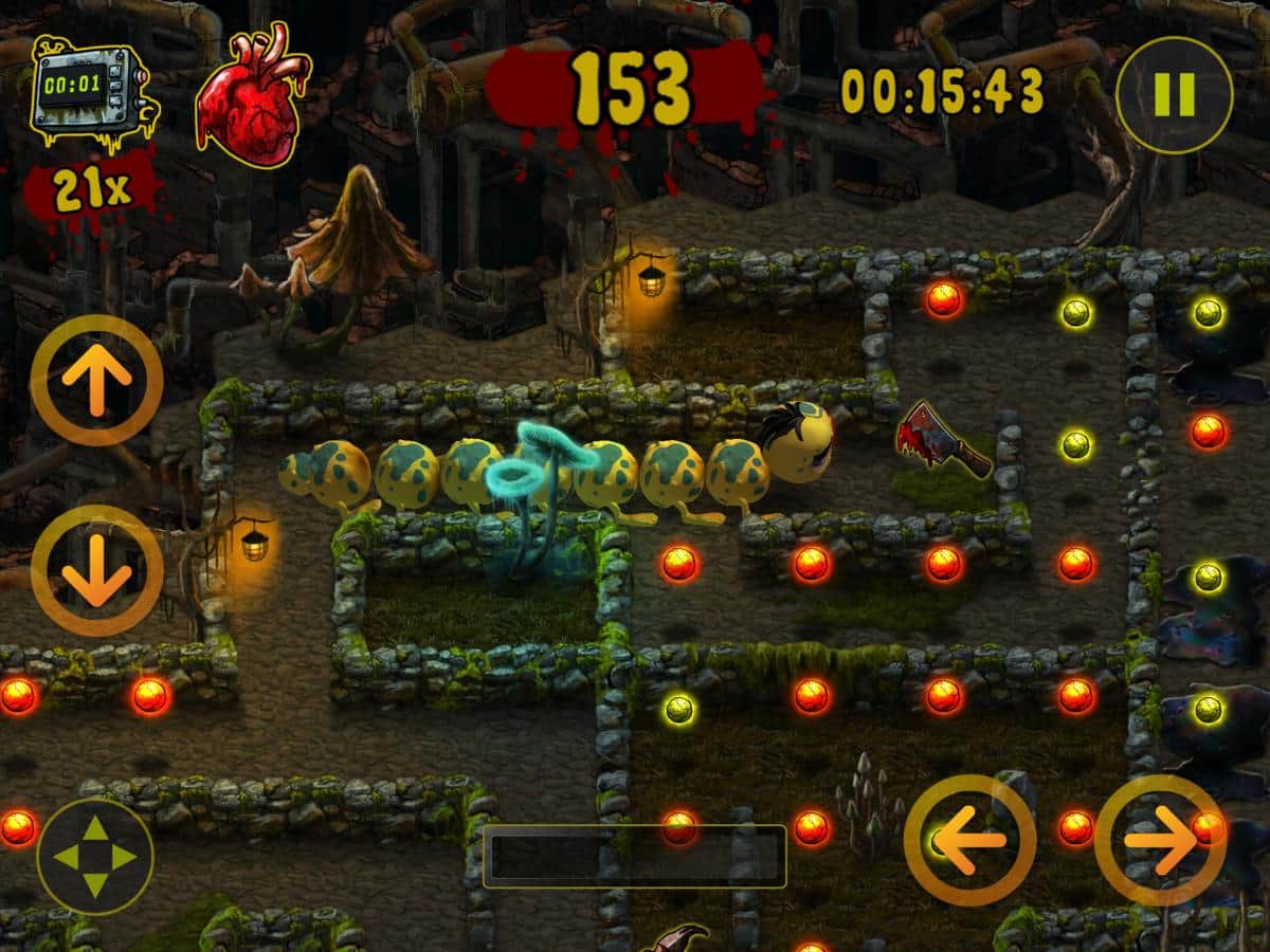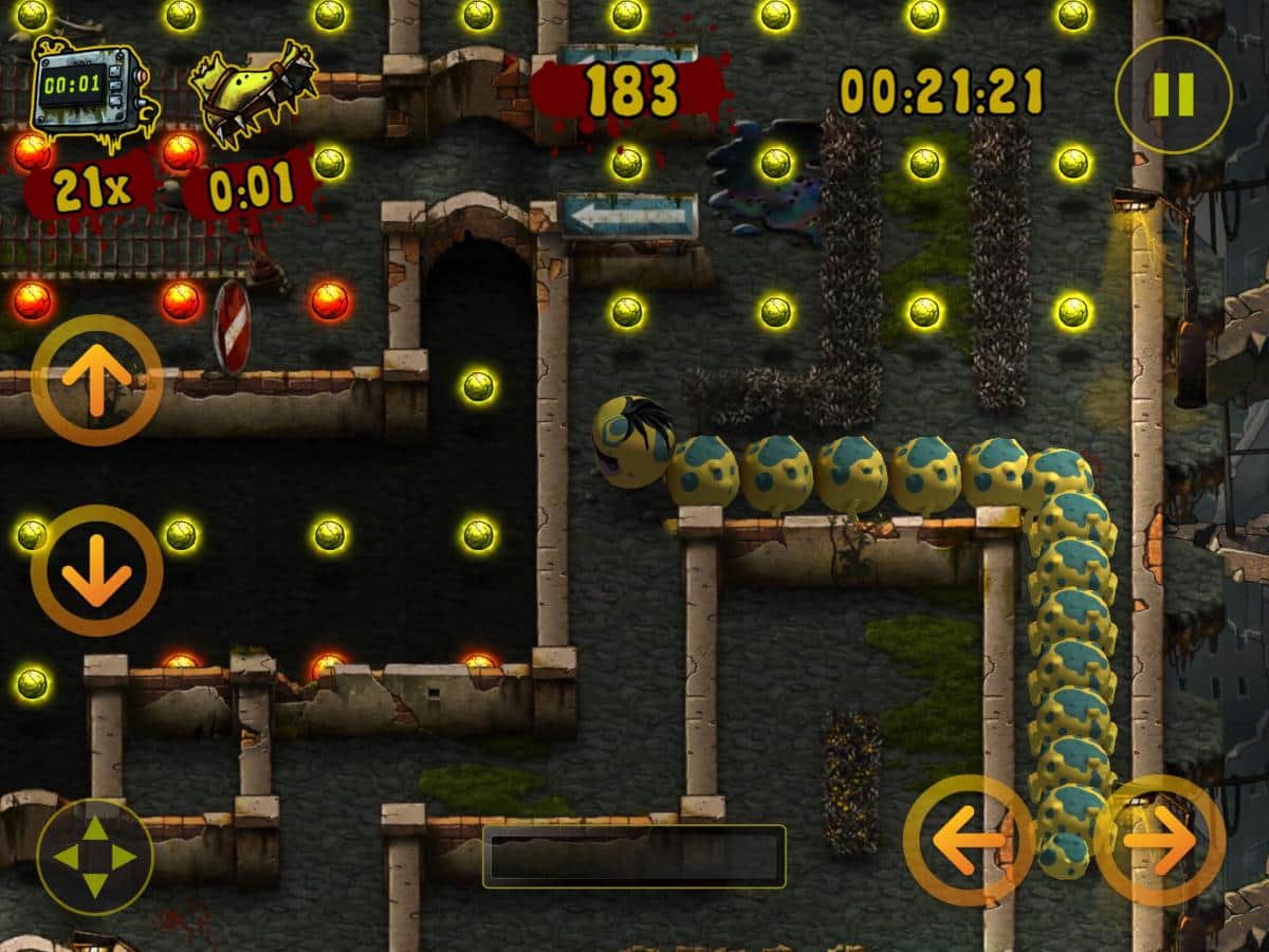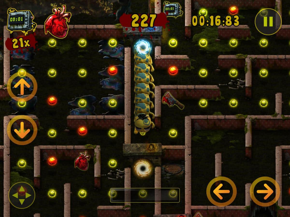 Zombillie – un emocionante juego de arcade para IOS donde ayudas a la oruga a recolectar comida. En este juego te encuentras en un mundo después de un Apocalipsis zombie, donde ayudarás a la oruga a recolectar los trozos de carne mientras te mueves a través de un laberinto complejo. Avanza y recoge trozos de carne, mientras intentas no chocar con su cola. Durante el transcurso del nivel, tu oruga aumentará de tamaño y te será difícil llegar al final del juego. Las características principales del juego son 100 niveles distintos, 3 ubicaciones, 2 mini-juegos y muchos bonos y potenciadores.