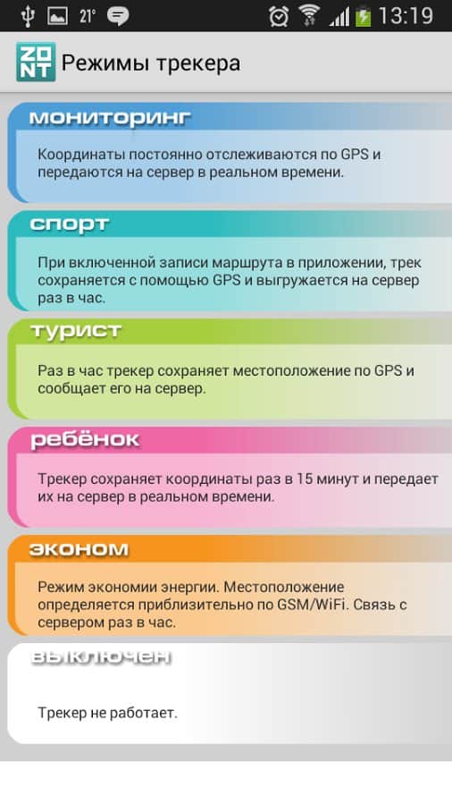ZONT Tracker – una aplicación muy digna con buena funcionalidad para el control de la ubicación del teléfono necesario y, por lo tanto, de su propietario. Este tipo de programa será muy útil para todos y cada uno, nunca se sabe en qué momento podría serte útil, ya sea que tengas un niño pequeño, padres ancianos o un amigo que le gusta desaparecer y no dar señales de vida. En resumen, mantén la tranquilidad por tus seres queridos.